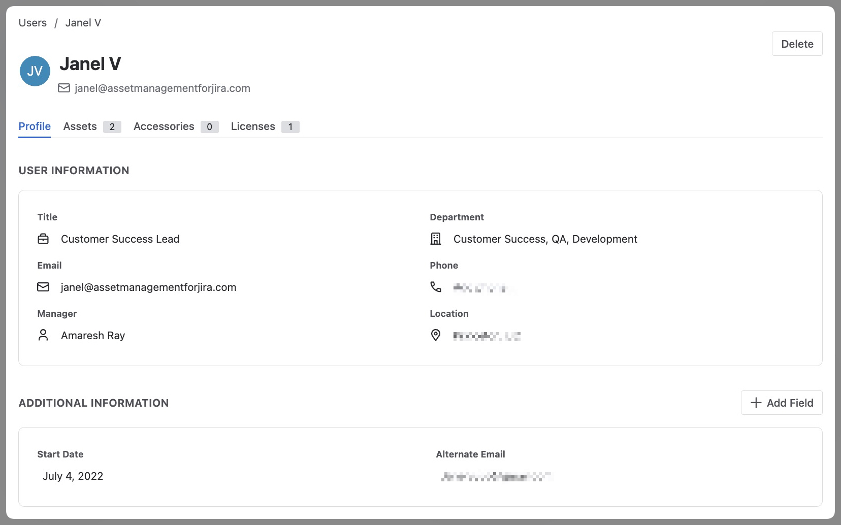 From the User Profile page, you can add and update user details directly using inline editing. Simply click into a field to add or update information such as phone number, location, department, manager, or email.