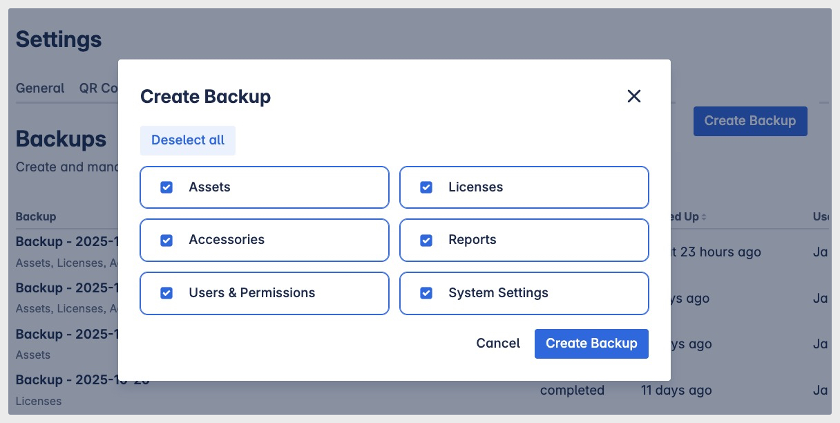 | Backup (manual) | Take a snapshot of Assets, Licenses, Accessories, Users, Reports, and Permissions & System Settings. Can back up all categories or selectively. |
