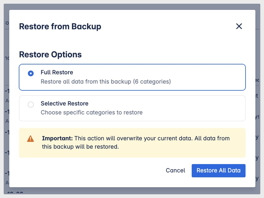 - Restore Backup: Click Restore on a backup, choose full or selective restore, and confirm